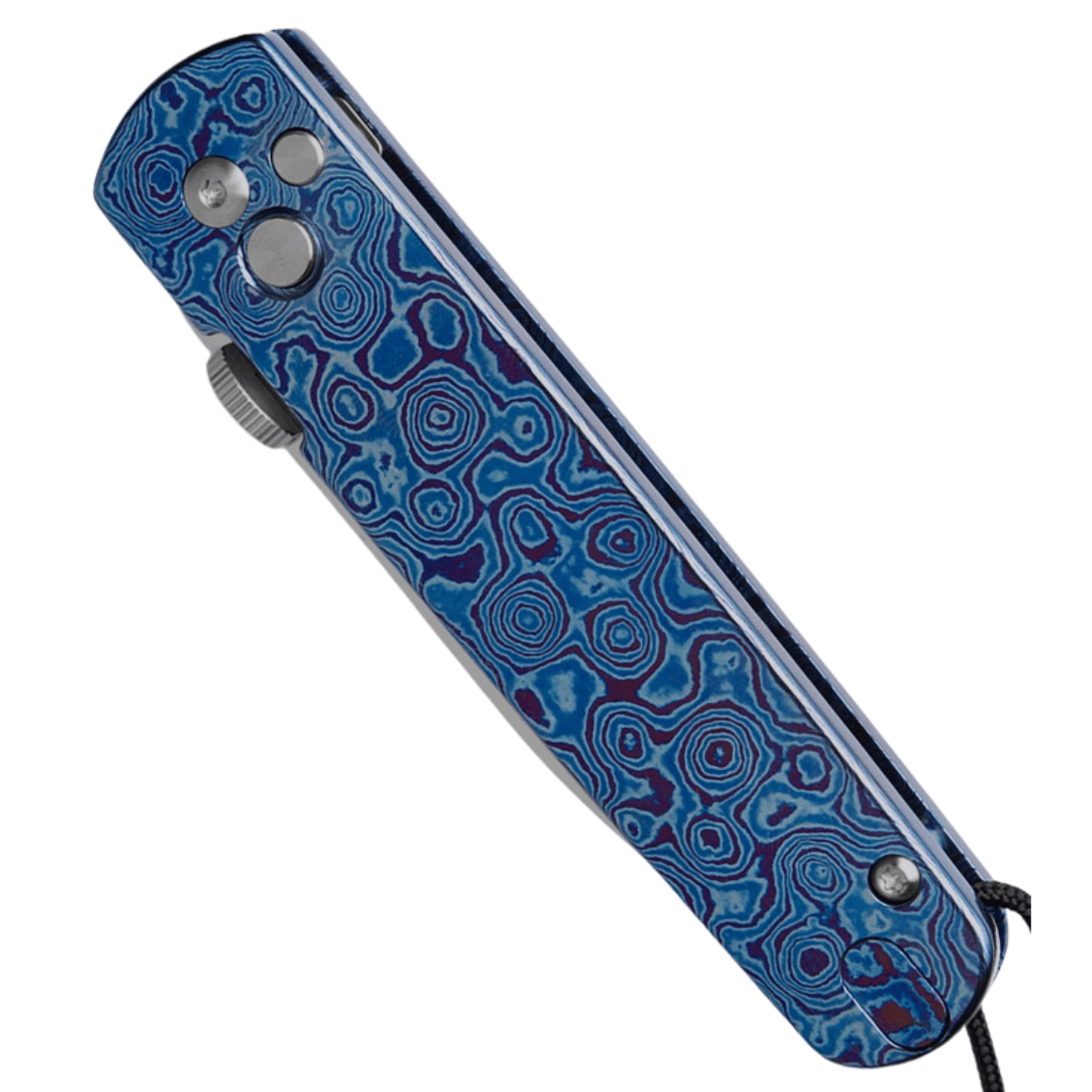 Das ist es! Das ultimative Stück für Sammler und Enthusiasten. CJRB wählt ihr Titanium Damascus speziell wegen der leuchtend blauen Töne und der engen Muster aus, die nach dem finalen Ätzprozess entstehen, und das Ergebnis ist schlichtweg atemberaubend. Das All Dressed Up Locust ist reines Taschenjuwel, mit den wunderschönen Juwelentönen des Titanium Damascus und der vollständig handpolierten Klinge. Dies ist ein absoluter Hingucker und zweifellos die edelste Version des Locust, die CJRB anbietet.