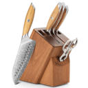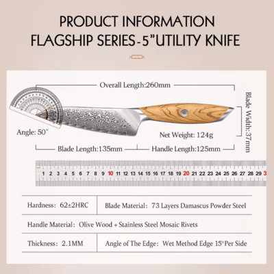 Jedes Messer im Set ist mit einem Griff aus natürlichem Olivenholz ausgestattet, der elegant durch ein Edelstahl-Mosaiknieten akzentuiert wird und einen Hauch von Raffinesse verleiht. Das ergonomische Design sorgt für eine bequeme Passform in der Hand und bietet präzise Kontrolle und einen zuverlässigen Griff – egal ob Sie schneiden, würfeln oder Zutaten für jede kulinarische Aufgabe vorbereiten.