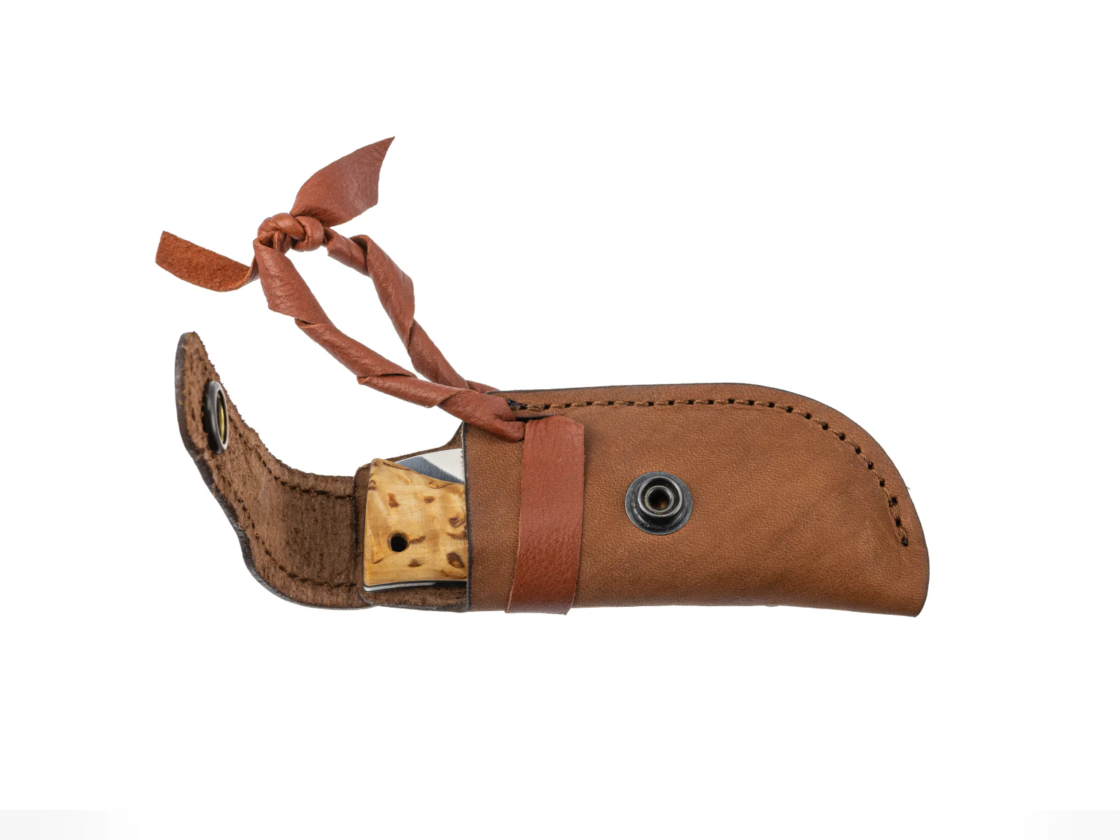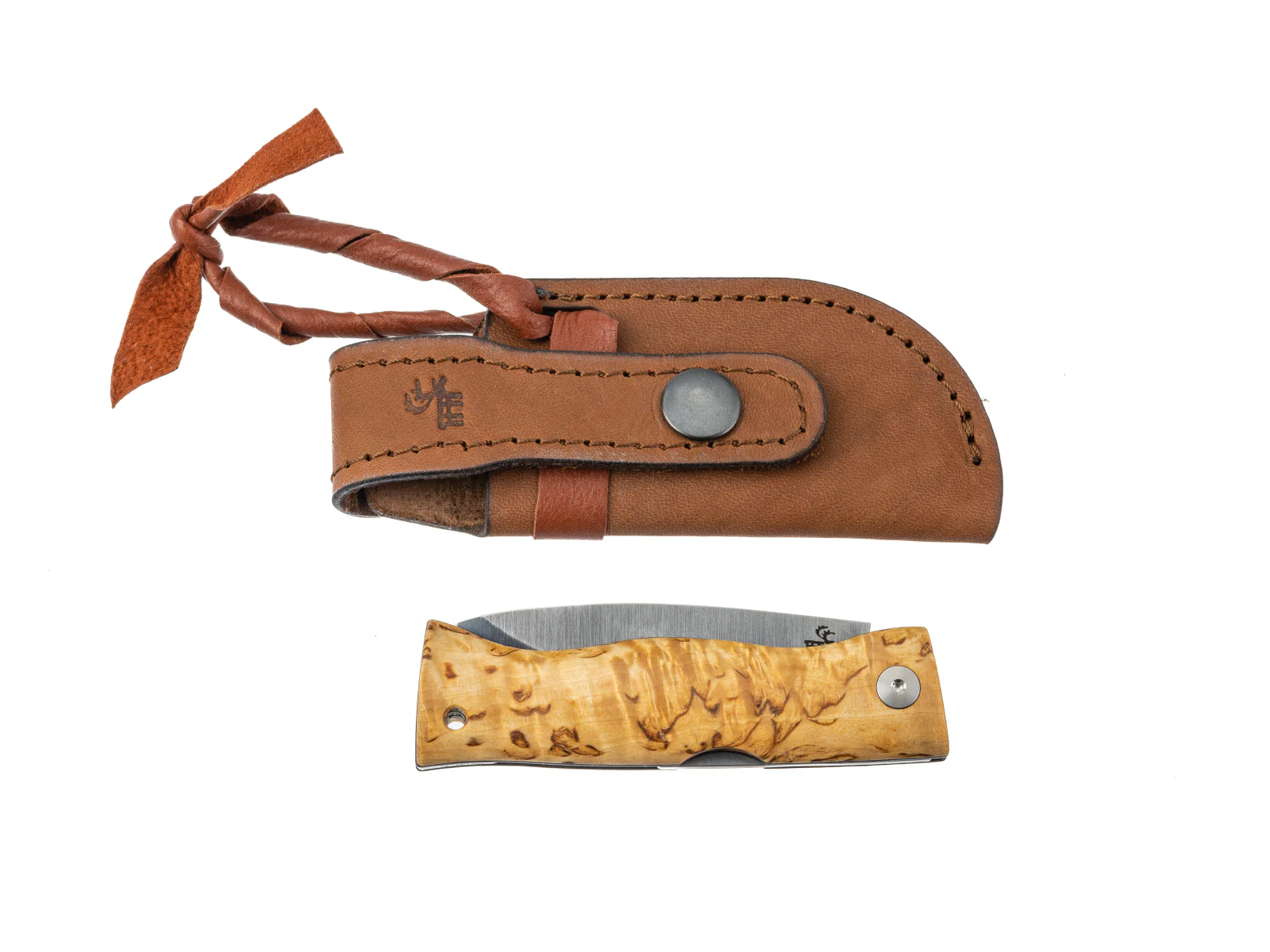 Karesuando ist vor allem für seine feststehenden Jagdmesser bekannt, die in traditioneller Bauweise aus hochwertigen Materialien handgefertigt werden und selbst unter arktischen Bedingungen zuverlässig funktionieren. Mit dem Pältsa präsentiert der schwedische Hersteller ein klassisch anmutendes Taschenmesser, das dank moderner Elemente den heutigen Anforderungen voll gerecht wird. Das zweihändige Messer verzichtet auf eine Öffnungshilfe für ein aufgeräumtes Erscheinungsbild und verriegelt die Schneideklinge aus RWL34 mit dem in Zusammenarbeit mit Fox Knives entwickelten Back Lock. Carbon fiber Elemente im Griffskelett reduzieren zusätzlich das Gewicht. Der Griff besteht aus edlem Maserbirkenholz und liegt angenehm in der Hand. Das Messer wird mit einem feinen Lederetui geliefert.