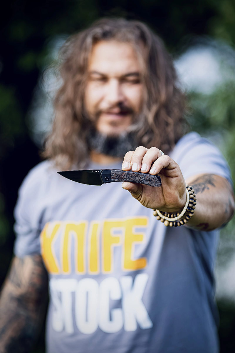 Der Griff besteht aus einer Kombination von 6063-T6 Aluminium und Dark Matter FatCarbon mit Kupferanteil. Das Aluminium sorgt für Stabilität und Festigkeit, während FatCarbon ein einzigartiges Aussehen und angenehmen Halt bietet – robust und dennoch leicht für längere Einsätze.