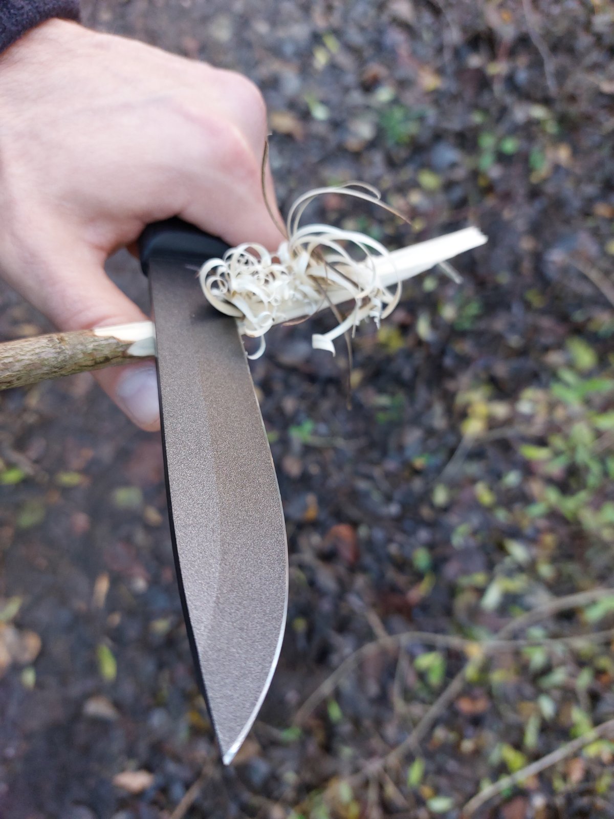 Die Klinge und der Griff sind für Arbeiten im Freien wie die Zubereitung von Brennholz und Lebensmitteln gut geeignet, während die Klinge dick, stark und lang genug für das Spalten von Holzscheiten ist. Die Klinge ist sehr scharf und die Schnitthaltigkeit ist wirklich gut, was bedeutet, dass man sie nicht allzu oft schärfen muss. Abgesehen davon ist er wie die meisten Kohlenstoffstähle leicht zu schärfen. Das Auskratzen von Holzspänen funktioniert wunderbar, und auch recht feine Schnitzarbeiten sind ein Kinderspiel, ebenso wie das Hacken von grobem Holz. Sie können Ihren Daumen auf die Rückseite der Klinge legen, da sie keine scharfen Kanten hat. Der hohe Säbelschnitt verleiht der Klinge Stärke, aber die Gesamtgeometrie eignet sich gut für die Arbeit in der Campingküche. Es ist eine gute Mischung aus Stabilität und Schneidfähigkeit.