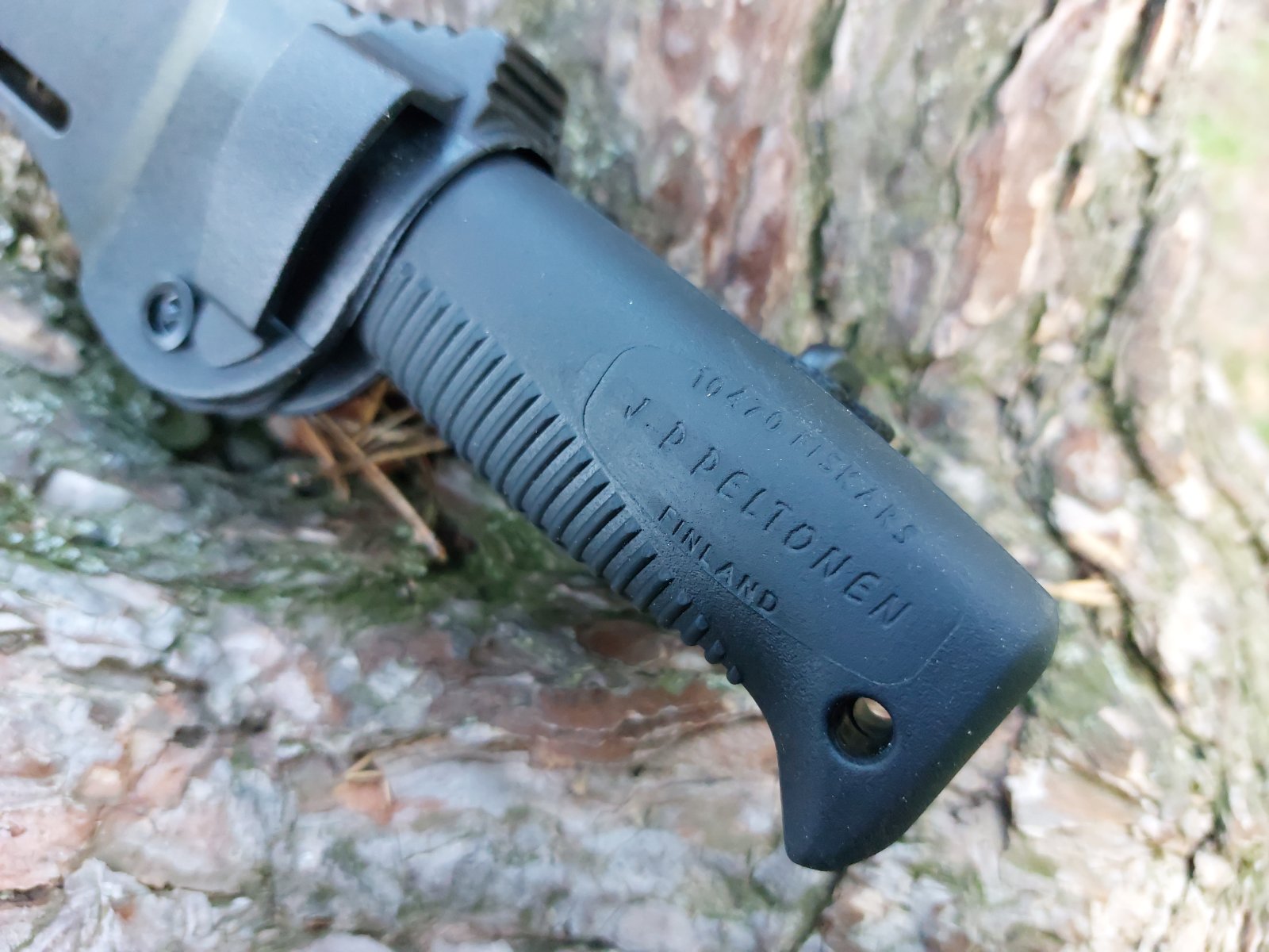 Das Messer ist in Full-Tang-Konstruktion, mit einem Spritzguss-Thermoplast, die aussieht und fühlt sich wie Gummi. Wenn der Tang auf der Rückseite freiliegen würde, könnte er für leichte Schläge verwendet werden. Kapitän. Peltonen erwähnte, dass er dies in Erwägung gezogen hatte und dass dies seine ursprüngliche Absicht war, aber technische Gründe ihn dazu zwangen, dies zu ignorieren. Er spielt immer noch mit dem Gedanken, befürchtet aber, dass dies zu einer missbräuchlichen Verwendung des Messers führen würde, und damit könnte er Recht haben, wenn man bedenkt, mit welcher Dummheit und Misshandlung manche Leute ihre Messer zerstören. Der Punkt ist, dass, wenn dieses Messer ist gut genug für die Special Forces und das Militär, es ist mehr als angemessen für Zivilisten und Abenteurer auf der ganzen Welt.