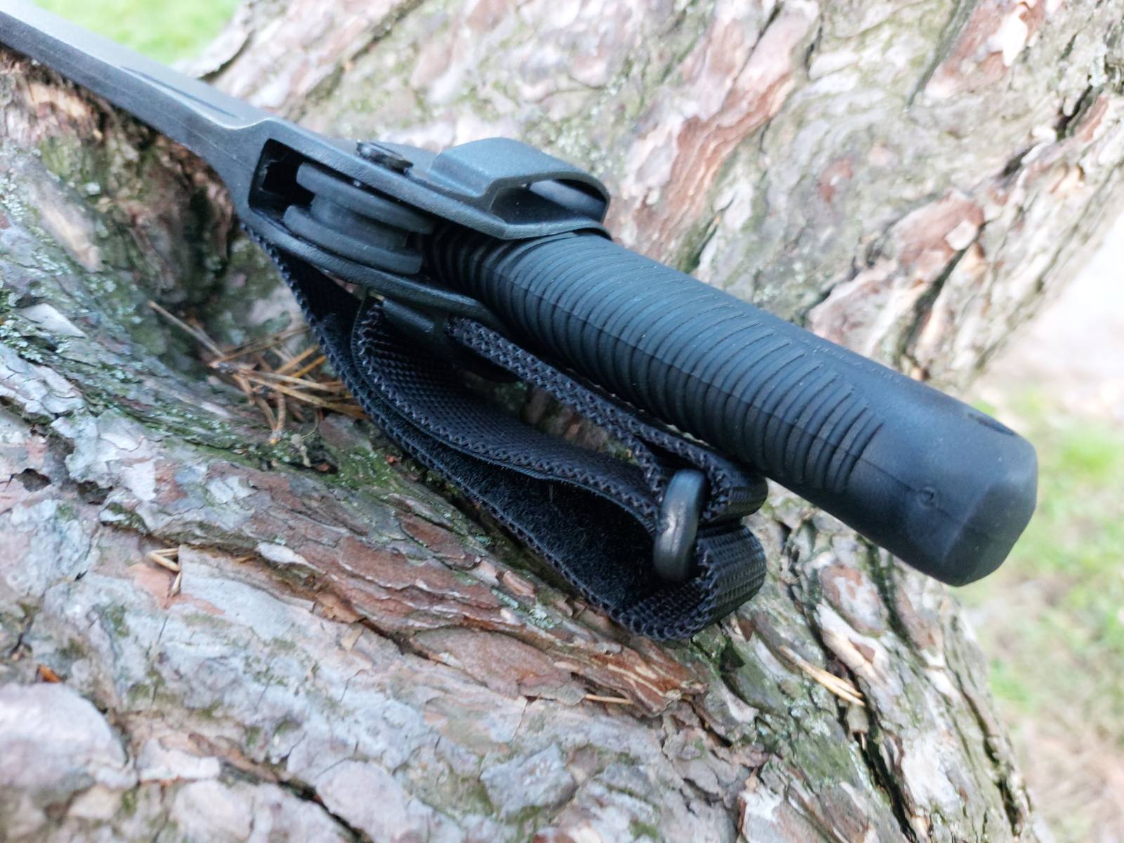 Die Gürtelschlaufe ist mit einem Klettverschluss versehen und kann entweder traditionell am Gürtel oder seitlich vom Etui befestigt werden, um die Scheide kopfüber an einen Rucksack oder einen Kampfgurt zu hängen. Das Kunststoffholster kann sowohl für Links- als auch für Rechtshänder verwendet werden, da es auf beiden Seiten eine einheitliche Form hat und die Gürtelschlaufe auf beiden Seiten angebracht werden kann, wie auf dem Bild oben zu sehen, wobei die linke Schlaufe verwendet wird. an der Außenseite der Scheide sichtbar.