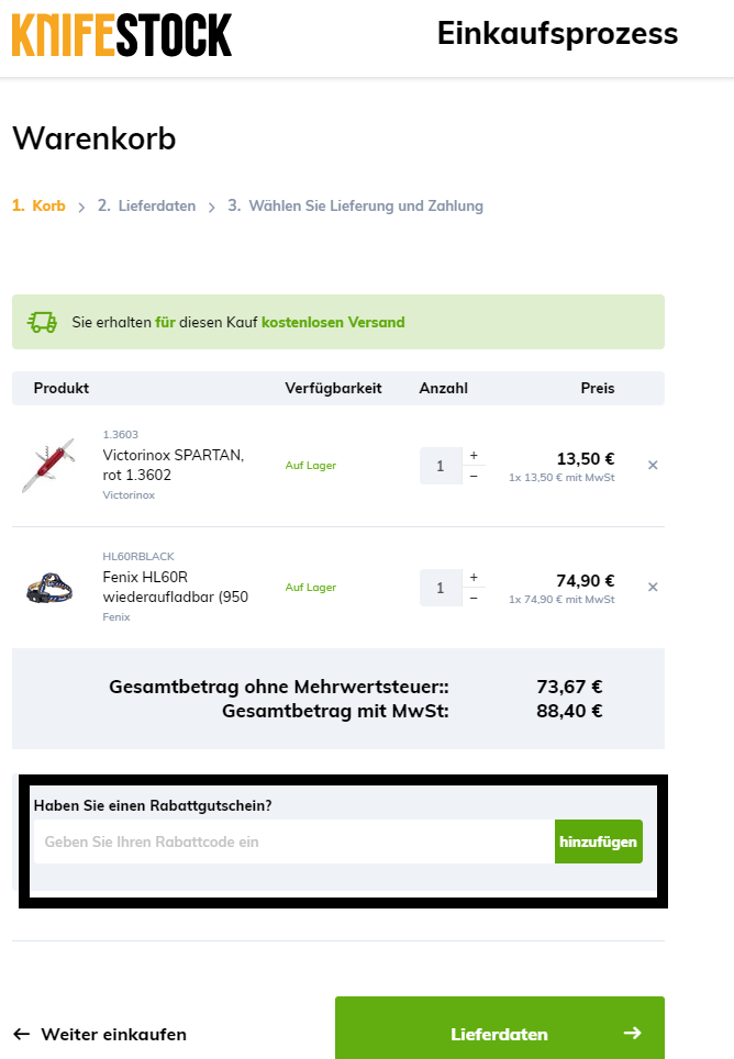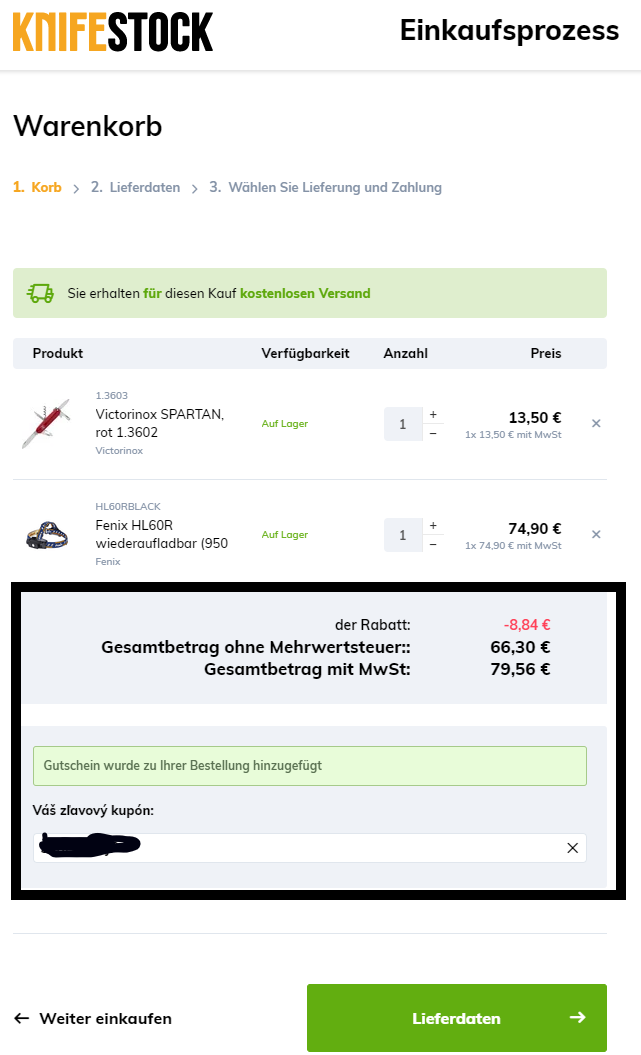 Anschließend wird der Wert des Rabattcoupons vom Bestellwert abgezogen, und Sie können mit dem Kaufvorgang auf der Seite LIEFERDATEN fortfahren, siehe. Abb. unten