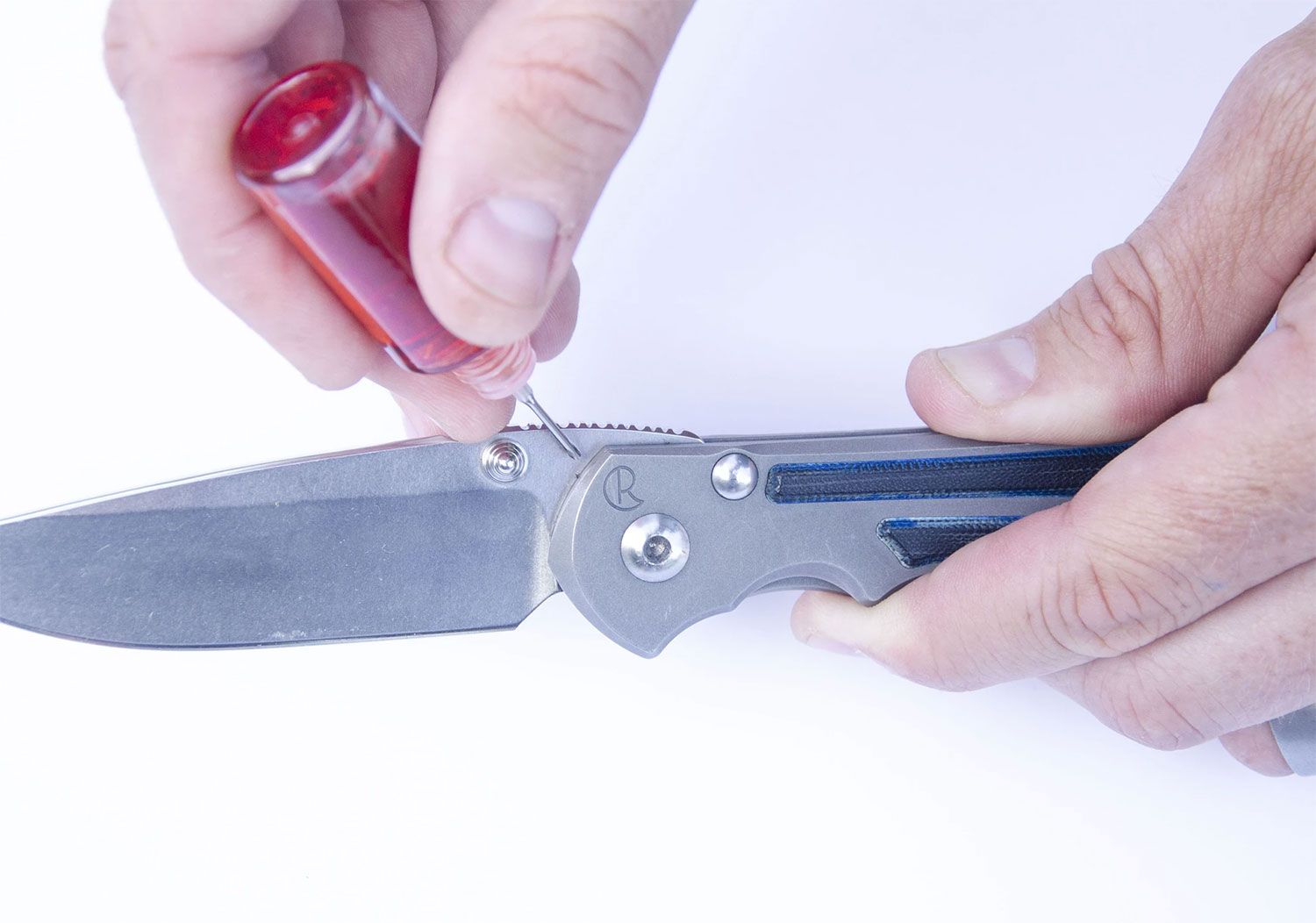 Wenn Sie das Messer nicht zerlegen wollen, ist Druckluft, vorzugsweise mit einer langen, dünnen Düse, praktisch. Befeuchten Sie ein Papiertuch mit Alkohol und reinigen Sie alle flachen Oberflächen. Beim Reinigen der Klinge ist besondere Vorsicht geboten, um sich nicht zu schneiden. Verwenden Sie ein Wattestäbchen für Falten und enge Stellen. Vergessen Sie natürlich nicht, die Schrauben vom Kleber zu reinigen. KPL hat einen kompletten Reinigungskit auf den Markt gebracht, so dass wir alles, was wir brauchen, in einem Paket haben.