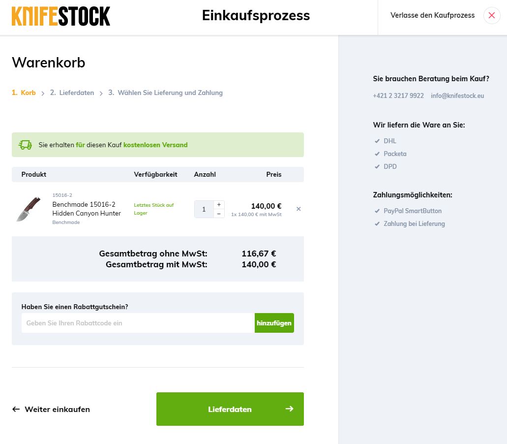 Wenn Sie alle ausgewählten Produkte in der Warenkorboberfläche haben und eine Bestellung aufgeben möchten, klicken Sie auf die Schaltfläche "LIEFERDATEN". Wenn Sie den Rabattcode verwenden, die Menge ändern oder das Produkt löschen möchten, können Sie dies direkt im "WARENKORB" tun. Wenn Sie dem Warenkorb etwas hinzufügen möchten, müssen Sie auf "WEITER EINKAUFEN" klicken.