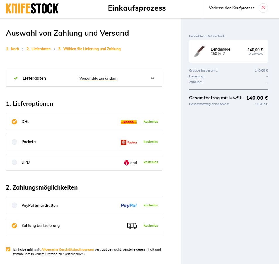 Der nächste Schritt ist "LIEFERUNG UND ZAHLUNG", wobei Sie die Transportmethode und die Zahlungsmethode auswählen. Nach Auswahl der erforderlichen Methoden müssen Sie sich mit den Geschäftsbedingungen des Online-Shops https://www.knifestock.at/ vertraut machen und die Einwilligung ankreuzen.