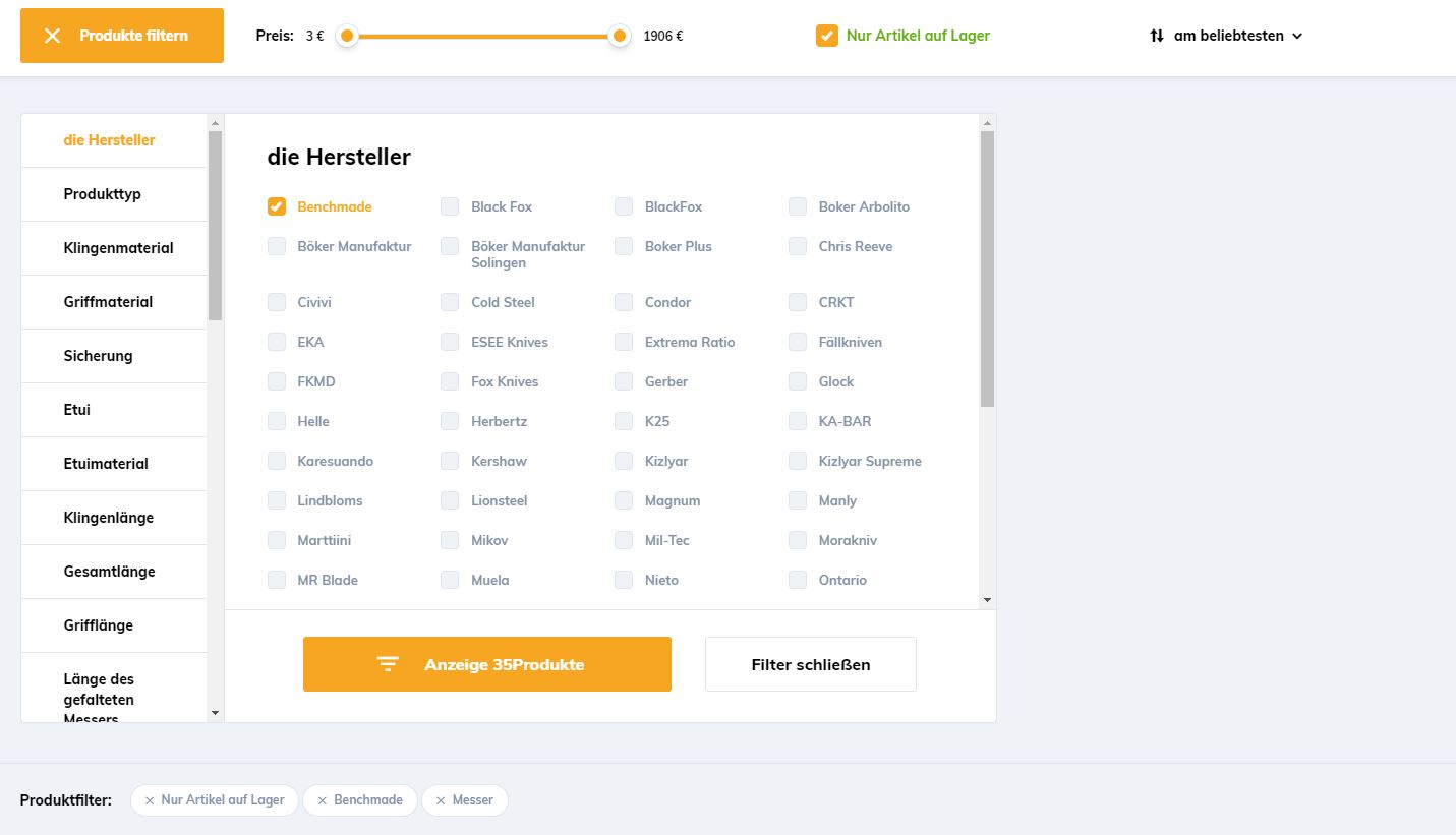 Für eine detailliertere Auswahl bestimmter Produkte können Sie den Filter "Filterprodukte" auswählen, der links in der angegebenen Unterkategorie über den angezeigten Produkten angezeigt wird. Hier können Sie Ihre Auswahl basierend auf Preis, Marke und anderen Parametern für das Produkt in dieser Kategorie verfeinern.
