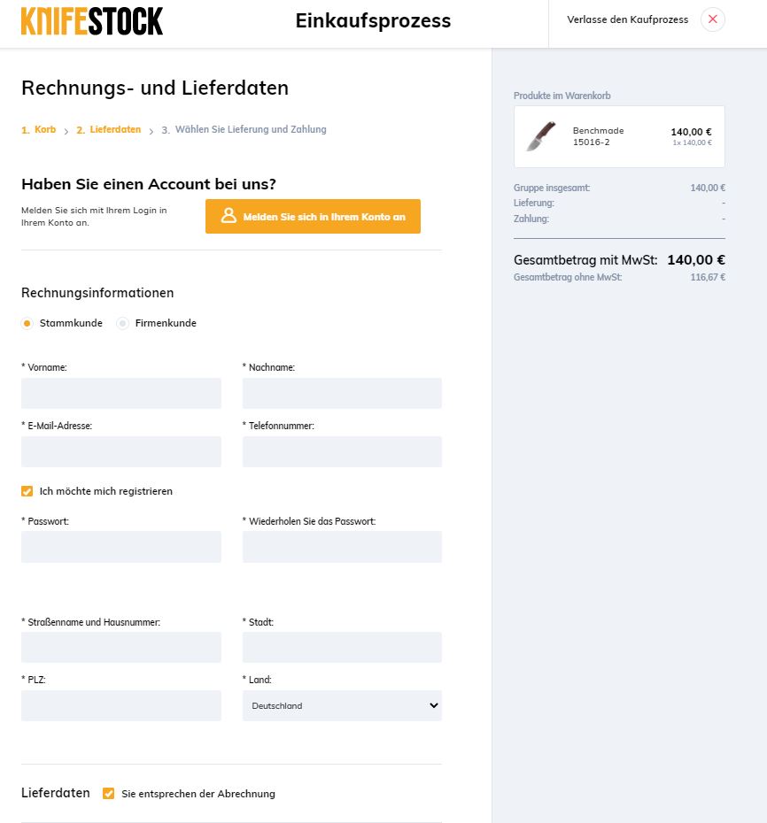 In diesem Schritt gelangen Sie zur Auswahl der Rechnungs- und Lieferdaten. In diesem Schritt ist es auch möglich, der Bestellung einen Hinweis hinzuzufügen, falls Sie uns über Tatsachen im Zusammenhang mit der Bestellung informieren möchten.