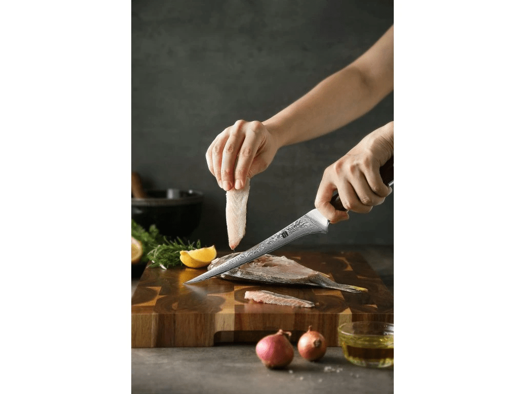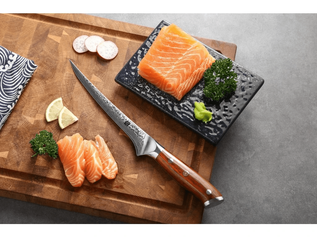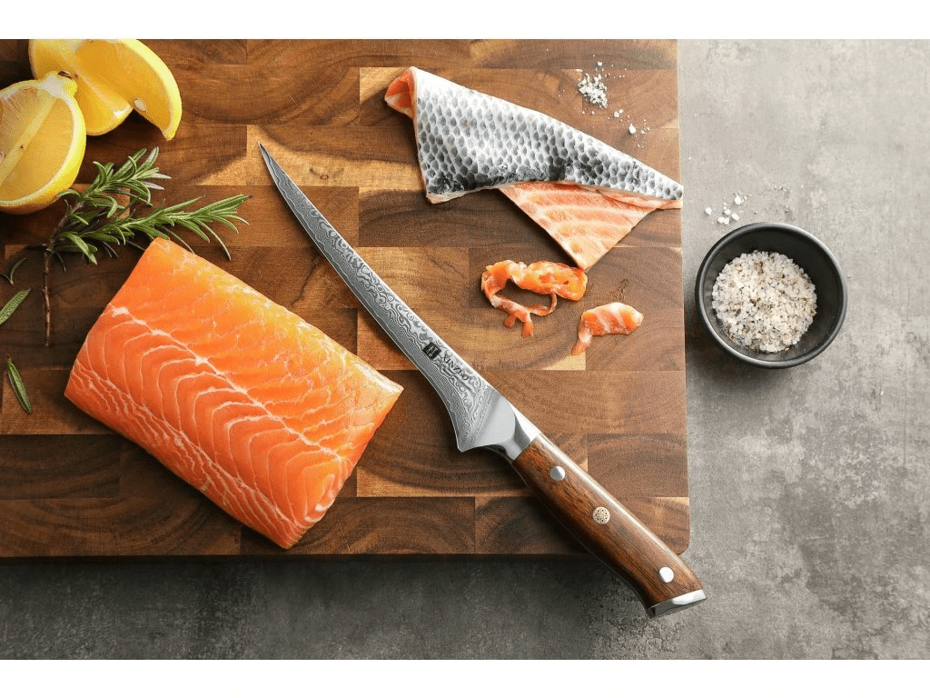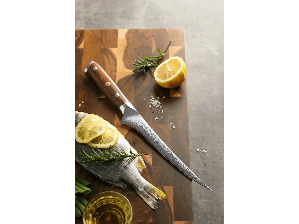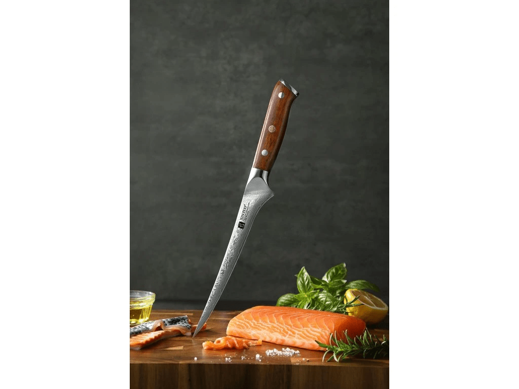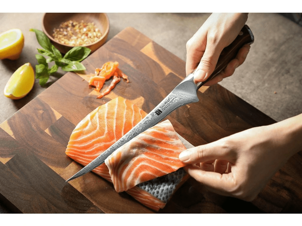 Das XINZUO B13R-YD Fillet Knife ähnelt stark einem Ausbeinmesser, jedoch besitzt das Fillet Knife eine dünnere und flexiblere Klinge. Dank der Flexibilität der dünneren Klinge kann sie sich biegen, sodass Sie nah an der Haut oder den Knochen von Fisch oder Huhn schneiden können. Besonders praktisch beim Schneiden von Hähnchen, insbesondere der Bruststücke. Es hilft Ihnen, dünnere Scheiben zu schneiden und unerwünschtes Fett zu entfernen.
